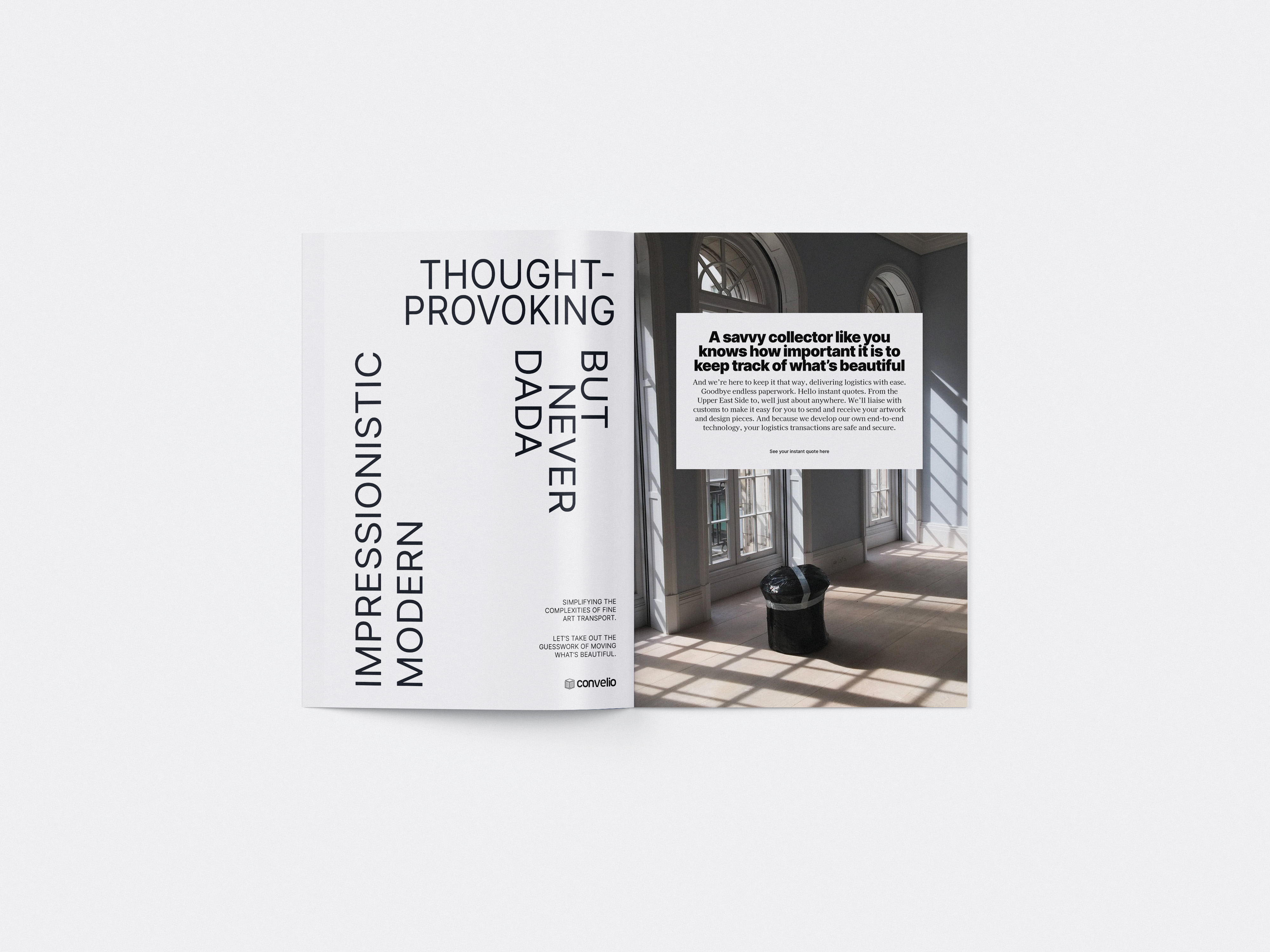 2022-2023, ParisConvelio est une société de transport d’oeuvres d’art. Avec des bureaux à Paris, Londres et New York, Convelio travaille auprès d’antiquaires, foires d’art et galeries pour rendre le transport d’oeuvres d’art plus simple, efficace et abordable. Mon rôle au sein de Convelio a été de définir l’identité visuelle de la marque et d’apdater cette nouvelle identité sur les différents supports de communication.